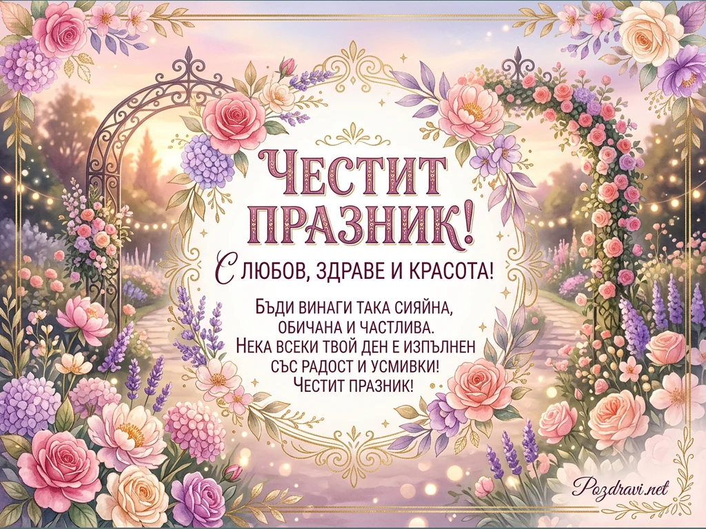Тази празнична картичка изобразява живописна градина с арка, обсипана с цветя и светещи гирлянди. Нежни акварелни рози, хортензии и лавандула в пастелни розови и лилави нюанси рамкират централното послание. В средата е изписано 'ЧЕСТИТ ПРАЗНИК! С ЛЮБОВ, ЗДРАВЕ И КРАСОТА!', последвано от пожелания за сияйност, обич, щастие, радост и усмивки. Общата атмосфера е елегантна, топла и изпълнена с празнично настроение.