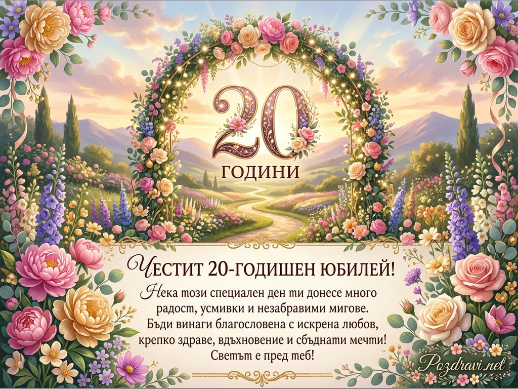 Тази празнична картичка изобразява живописна градина с извит път, водещ към планински пейзаж под залязващо слънце. В центъра е разположена пищна цветна арка, украсена със светлини, която обгражда златистите цифри '20 ГОДИНИ'. Цялата композиция е богато декорирана с разнообразни цветя в ярки нюанси на розово, лилаво, жълто и бяло, включително рози, божури и делфиниуми. В долната част е изписано пожеланието 'Честит 20-годишен юбилей!' с допълнителен текст за радост, любов и сбъднати мечти.