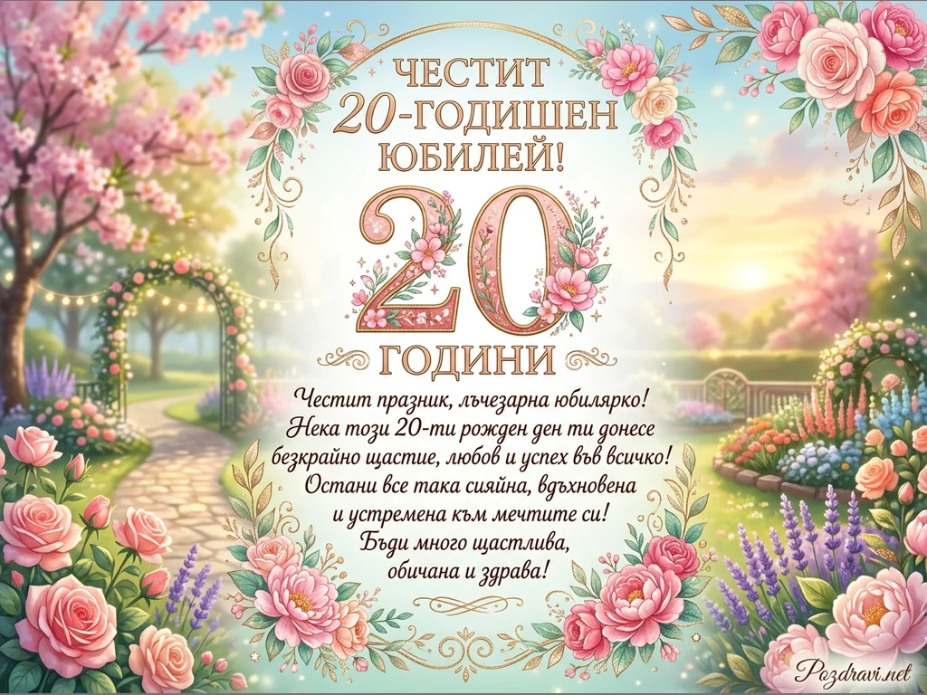 Тази празнична картичка отбелязва 20-годишен юбилей, изобразен с пищни флорални елементи. В центъра е изписано 'ЧЕСТИТ 20-ГОДИШЕН ЮБИЛЕЙ!' и голямо, украсено число '20 ГОДИНИ', обградено от нежни розови цветя и златни акценти. Фонът е живописна градина с разцъфнали розови храсти, лавандула и черешови цветове, с пътека и арка от светлини. Картичката съдържа и пожелание за щастие, любов и успех, създавайки топла и вдъхновяваща атмосфера.