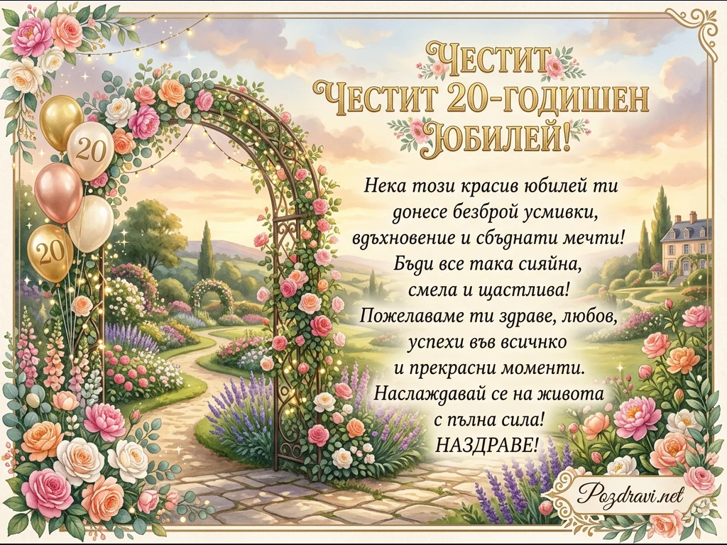 Картичка за 20-годишен юбилей, изобразяваща живописна градина с арка, обсипана с рози и светлинки. Каменна пътека се вие през цветни лехи от лавандула и други цъфтящи растения, водеща към далечен пейзаж с къща и хълмове. Вляво са разположени три балона в златисто, розово злато и бяло, всеки с числото '20', а цялата композиция е рамкирана от нежни цветя. Основният надпис 'ЧЕСТИТ 20-ГОДИШЕН ЮБИЛЕЙ!' е изписан с елегантен шрифт, придружен от пожелание за усмивки, вдъхновение и щастие.