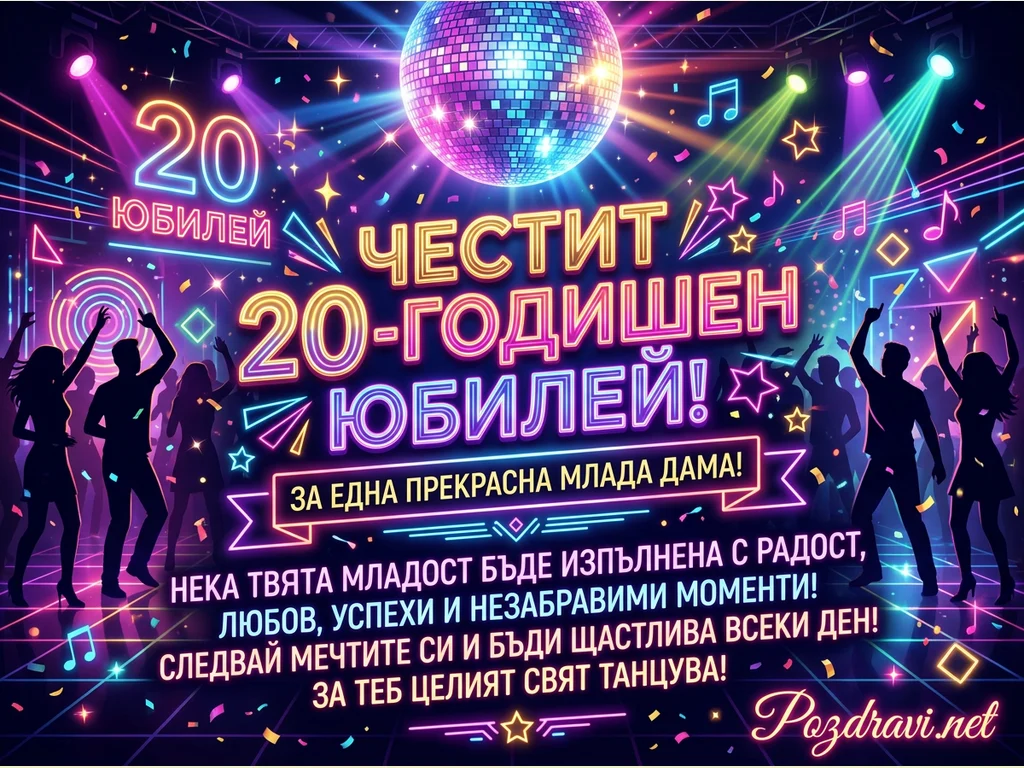 Ключови фрази: 20-годишен юбилей, Честит рожден ден, Поздравителна картичка, Неоново парти, Диско топка