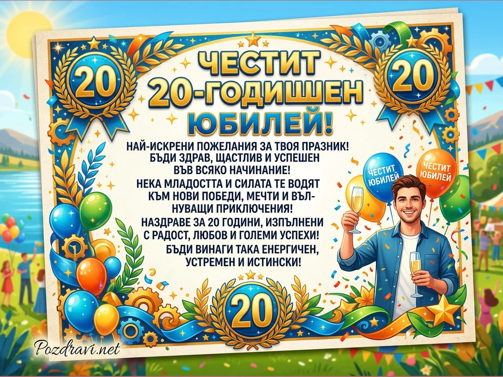 Тази ярка поздравителна картичка отбелязва 20-годишен юбилей с надпис 'ЧЕСТИТ 20-ГОДИШЕН ЮБИЛЕЙ!' в центъра. На нея е изобразен усмихнат млад мъж, който вдига тост с две чаши шампанско, заобиколен от цветни балони и конфети. Фонът показва живописна сцена на открито с езеро, зелени хълмове и празнуващи хора под слънчево небе. Дизайнът е богато украсен с лаврови венци, панделки и зъбни колела, подчертаващи числото 20. Картичката съдържа и текст с искрени пожелания за здраве, щастие и успехи.