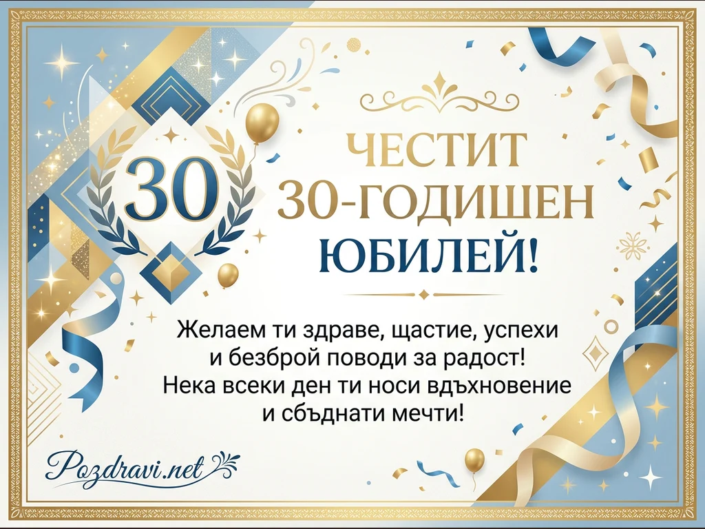 Тази елегантна поздравителна картичка е посветена на 30-годишен юбилей. Дизайнът е в изискана комбинация от златисти, сини и бели тонове, украсен с блестящи геометрични фигури, панделки, конфети и златни балони. В центъра е изписано голямо число '30', обградено от лавров венец, символизиращ постижение. Основният надпис гласи 'ЧЕСТИТ 30-ГОДИШЕН ЮБИЛЕЙ!', придружен от сърдечни пожелания за здраве, щастие, успехи и сбъднати мечти. Картичката носи празнично и тържествено настроение.