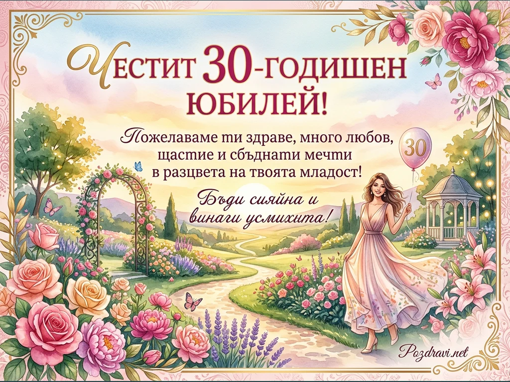 Тази поздравителна картичка отбелязва 30-годишен юбилей с пищен и живописен дизайн. В центъра е изобразена усмихната жена в елегантна розова рокля, която върви по извита пътека през разцъфнала градина, държейки балон с числото '30'. Около нея има изобилие от цветя като рози, божури и лавандула, както и пеперуди, създаващи приказна атмосфера. Надписът 'Честит 30-годишен ЮБИЛЕЙ!' е изписан с големи букви, придружен от сърдечни пожелания за здраве, любов, щастие и сбъднати мечти.