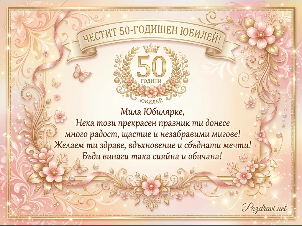 Празнична картичка за 50-годишен юбилей, издържана в нежни розови, прасковени и златисти тонове. Дизайнът е елегантен, с изобилие от флорални мотиви, перли, панделки и ефирни пеперуди, които създават бляскаво и луксозно усещане. В центъра е изписано 'ЧЕСТИТ 50-ГОДИШЕН ЮБИЛЕЙ!' на лента, а под нея '50 ГОДИНИ ЮБИЛЕЙ' е обградено от златен венец с корона. Картичката съдържа сърдечно пожелание за радост, щастие, здраве и сбъднати мечти към юбилярката. Цялостната визия е ефирна, празнична и изпълнена с топлота.