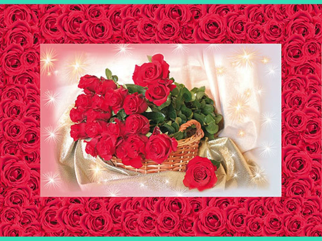Ключови фрази: Картичка поздрави пожелания пълна кошница алено червени рози елегантен празничен свадбен сатен юбилей