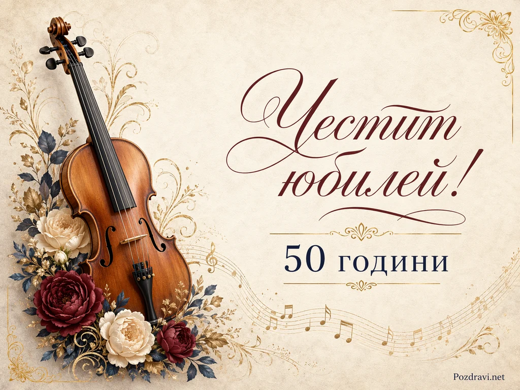 На светъл фон като стар пергамент, украсен с фини златисти орнаменти и завъртулки, е подредена елегантна юбилейна композиция. Вляво доминира цигулка в топли дървесни тонове, поставена диагонално и подчертана с меки сенки. Около нея има богат букет от цветя в бордо и кремаво, със зелени и синкави листа, които придават романтично и класическо усещане. В долната част преминава вълнообразен нотен ред с малки музикални ноти, който подсилва тематиката за музика и празник. В дясната половина са изписани с калиграфски шрифт думите 'Честит юбилей!' и под тях ясно се откроява '50 години'. Цялостното настроение е изискано, ретро и празнично, подходящо за тържество по случай кръгла годишнина.