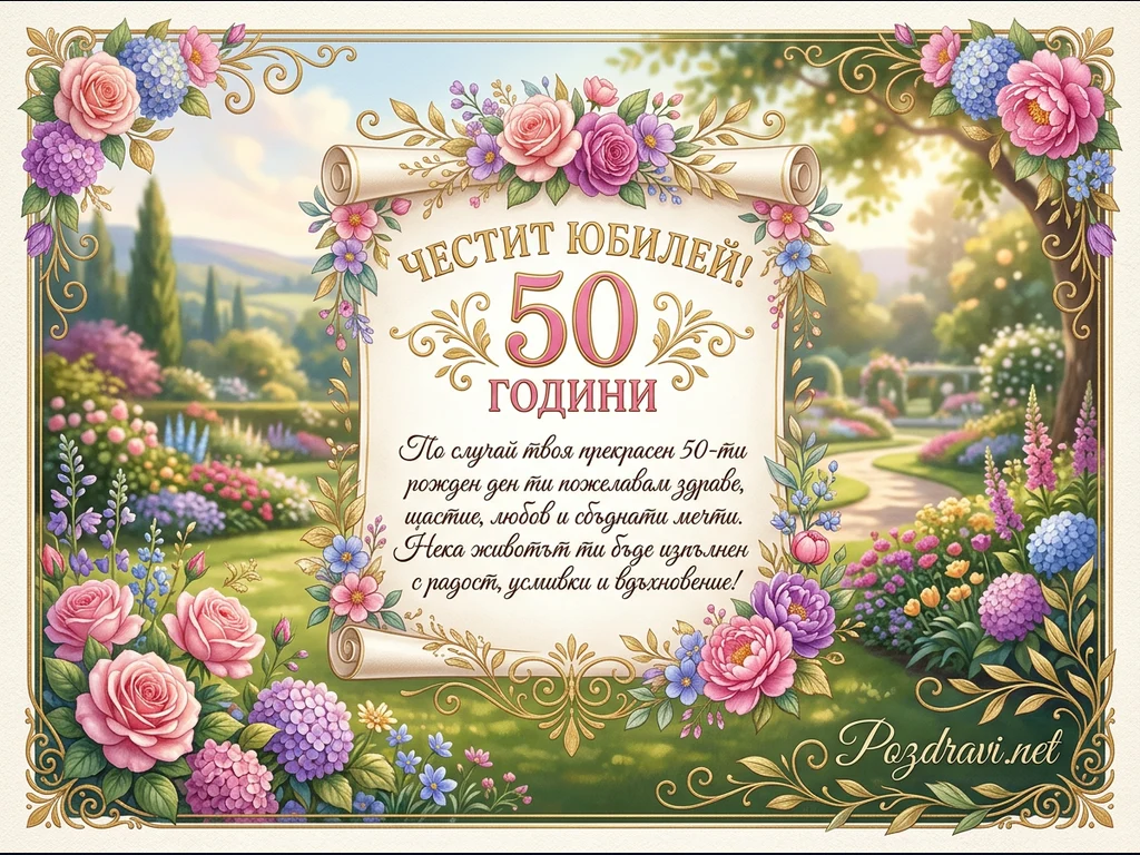 Тази празнична картичка за юбилей е оформена като свитък, обграден от пищни флорални гирлянди с розови рози, сини и лилави хортензии, и други нежни цветя. На преден план е изобразен разцъфнал градински пейзаж с алеи и множество цветни лехи под ясно небе. В центъра, върху свитъка, е изписано 'ЧЕСТИТ ЮБИЛЕЙ! 50 ГОДИНИ', придружено от пожелание за здраве, щастие, любов и сбъднати мечти. Златни орнаменти допълват елегантния дизайн, създавайки усещане за тържественост и красота.