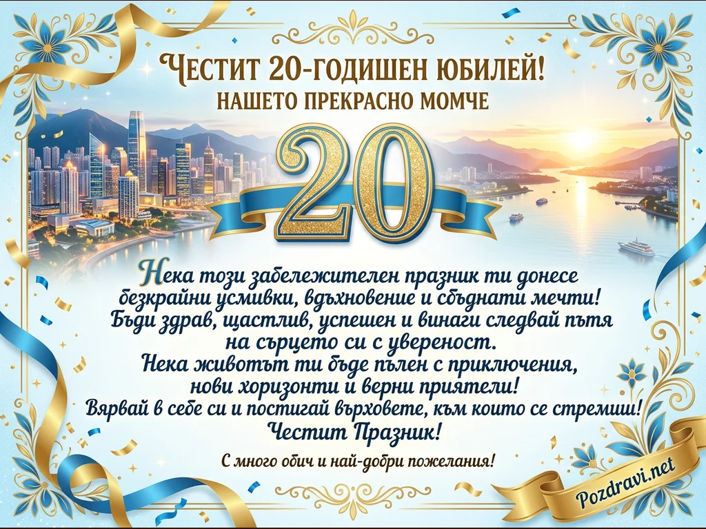 Тази празнична картичка отбелязва 20-годишен юбилей с елегантен дизайн. В центъра са разположени големи, блестящи златни цифри '20', преплетени със синя панделка, на фона на живописен пейзаж. Лявата страна показва модерен градски силует, докато дясната разкрива спокоен залез над воден басейн с планини. Картичката е украсена със сини и златни панделки, флорални елементи и разпръснати конфети, създавайки тържествена атмосфера. Текстът 'Честит 20-годишен юбилей! Нашето прекрасно момче' и пожеланията допълват посланието.