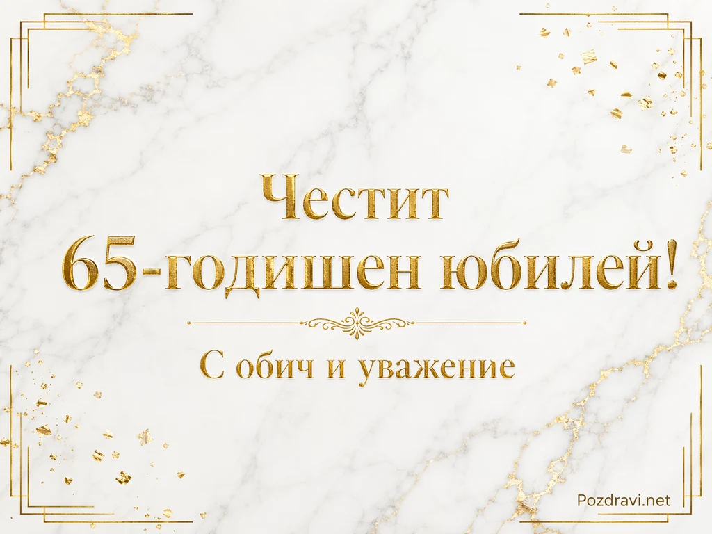 Фонът е бял мрамор с фини сиви жилки и златисти пукнатини, които придават луксозно излъчване. В ъглите има тънка правоъгълна рамка от златни линии с декоративни двойни акценти. По горния десен и долния ляв ъгъл са разпръснати дребни златни конфети и фрагменти, сякаш от празничен блясък. В центъра стои голям надпис с релефен златен ефект: 'Честит 65-годишен юбилей!'. Под него има тънка орнаментална линия с малък флорален мотив по средата. В долната част е изписано по-малко послание в същия златист стил: 'С обич и уважение'.