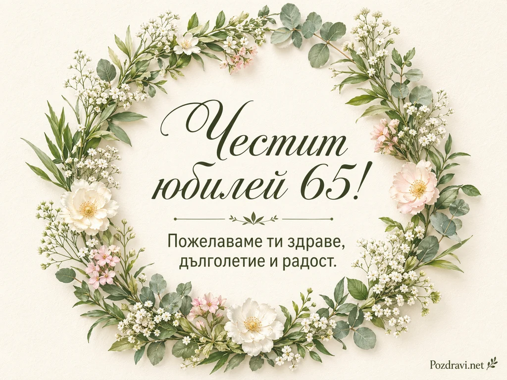Нежна картичка с акварелен венец от зелени листа и дребни бели цветчета обгръща светъл, текстуриран фон в кремаво. В композицията се открояват няколко по-едри цветя в бяло и бледорозово, разположени равномерно по кръга. В центъра има елегантен калиграфски надпис: 'Честит юбилей 65!'. Под него стои втори ред текст в по-изчистен шрифт: 'Пожелаваме ти здраве, дълголетие и радост.' Цветовата палитра е мека и пролетна, с доминиращи зелени тонове и пастелни акценти. Общото усещане е за тържественост, спокойствие и изискано празнично настроение.