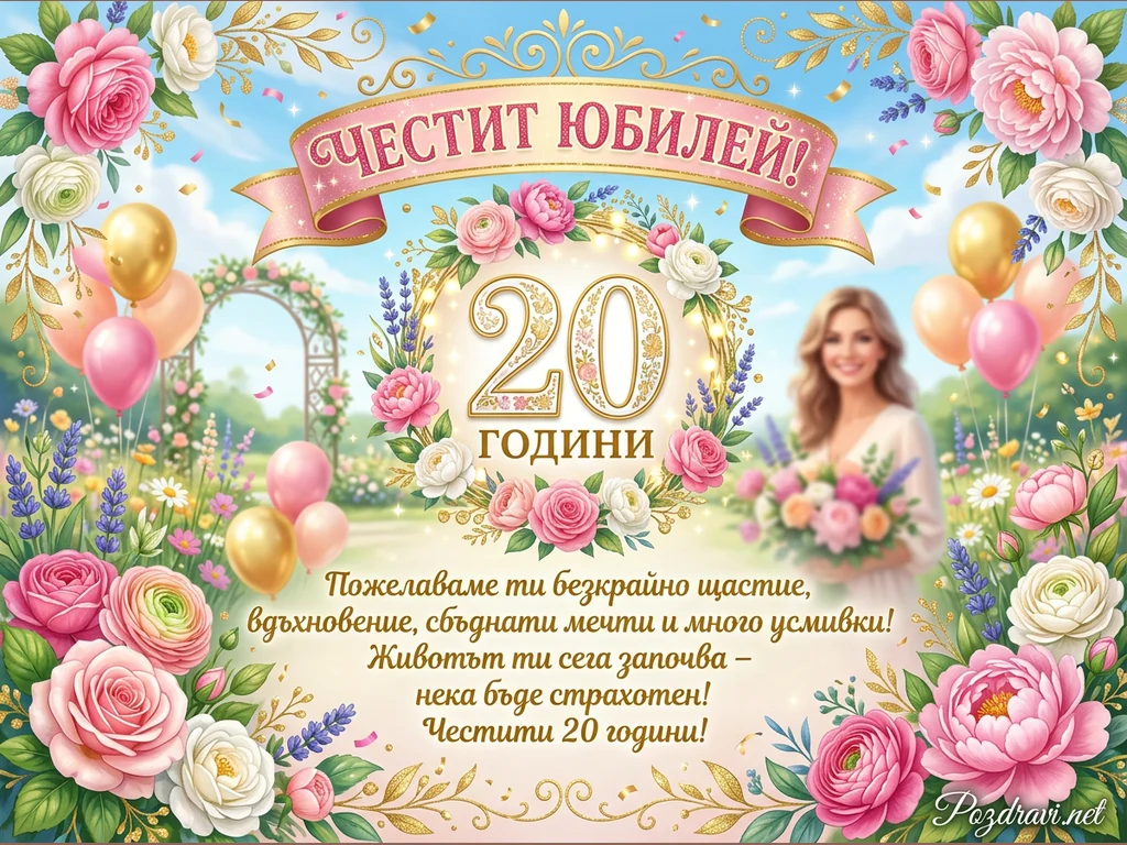 Празнична картичка за 20-годишен юбилей, изпълнена с ярки цветове и флорални мотиви. В центъра е разположен надпис 'ЧЕСТИТ ЮБИЛЕЙ!' на розова панделка, а под него – '20 ГОДИНИ', обградено от венец от рози и лавандула. Фонът е живописна градина с арка, балони в розово и златисто, и разпръснати конфети. Отдясно се вижда усмихната жена, държаща букет, а цялата композиция е богато украсена с пищни розови и бели рози и златни орнаменти. В долната част има сърдечно пожелание за щастие и сбъднати мечти.