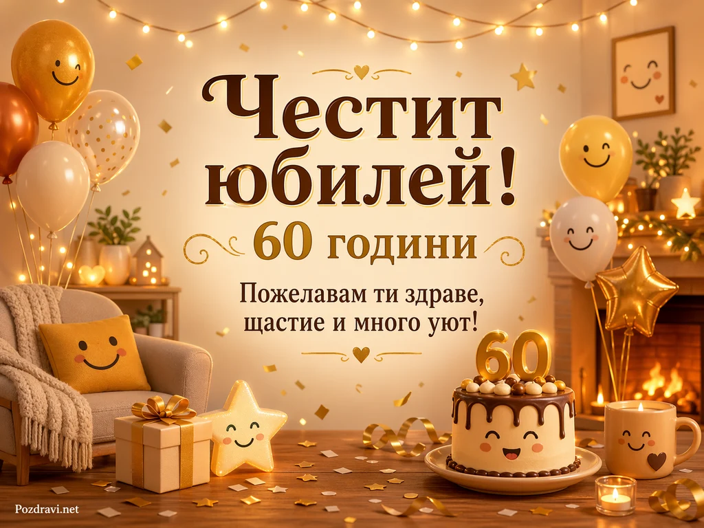 Уютна празнична сцена в топли златисти тонове изпълва стая с гирлянди от светлинки и разпръснати конфети. В центъра стои надписът 'Честит юбилей! 60 години Пожелавам ти здраве, щастие и много уют!'. Отляво има група балони, част от които са с усмихнати лица, а до тях се вижда мек фотьойл с възглавничка със смайли. На масата отпред са подредени подаръчна кутия и светеща звездичка с лице. Вдясно се откроява торта с шоколадова глазура и усмивка, украсена със свещи '60' и дребни топчета. До тортата има чаша със сърце, а на заден план гори камина и се виждат звезден балон и декорации, които подсилват празничното настроение.