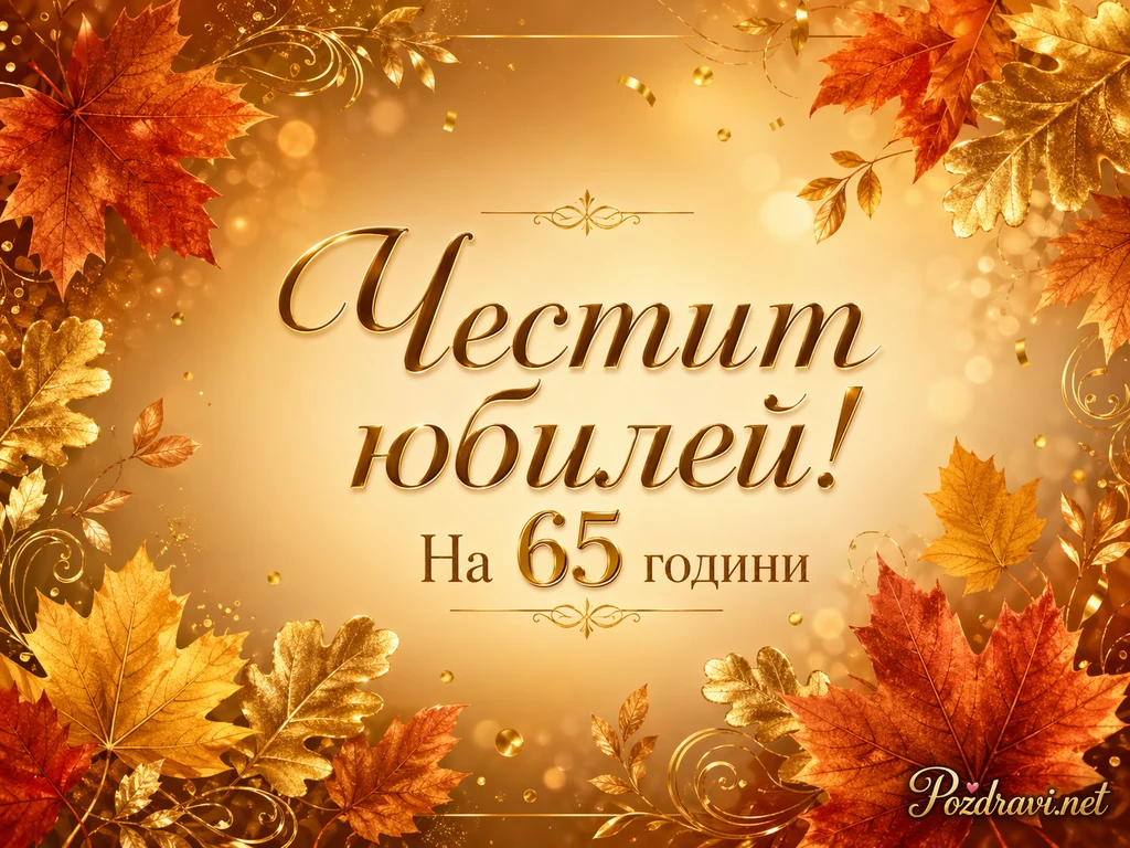 Златист фон с меко сияние и боке ефекти създава тържествена, топла атмосфера. По краищата са разположени есенни листа в медно, оранжево и златно, някои с блестяща текстура като метал. Декоративни завъртулки и нежни растителни орнаменти рамкират композицията и подсилват елегантния стил. Във въздуха се виждат малки конфети и искрящи частици, които добавят празнично настроение. В центъра с калиграфски, релефен златен шрифт е изписано: 'Честит юбилей!'. Под основния текст стои вторият ред: 'На 65 години', като числото 65 е по-едро и акцентира върху годишнината.