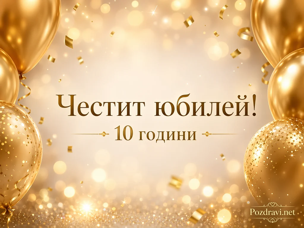 Златиста празнична сцена с меко сияние и ефект на боке изпълва фона. Отляво и отдясно се виждат големи златни балони, а наоколо се разпръскват лентички конфети и малки отблясъци. В долната част има бляскава златна повърхност, която напомня на брокат и отразява светлината. В центъра с елегантен шрифт е изписано: 'Честит юбилей! 10 години'. Композицията оставя чисто пространство около текста, което подчертава тържествения акцент. Общото усещане е за луксозен юбилеен празник в топли, златни тонове.