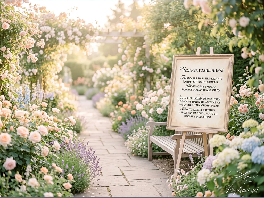 Снимката показва живописна градинска пътека, осветена от мека слънчева светлина. Пътеката е облицована с каменни плочи и е обградена от пищни цветни лехи с нежни розови рози, лавандула и други цъфтящи растения. Вдясно е поставен дървен статив с рамкиран надпис 'Честита годишнина!', съдържащ послание за любов, щастие и благотворителност. Зад статива се вижда дървена пейка, а в далечината – арка, обрасла с рози, създаваща романтична атмосфера. Цялостната сцена излъчва спокойствие и празнично настроение.