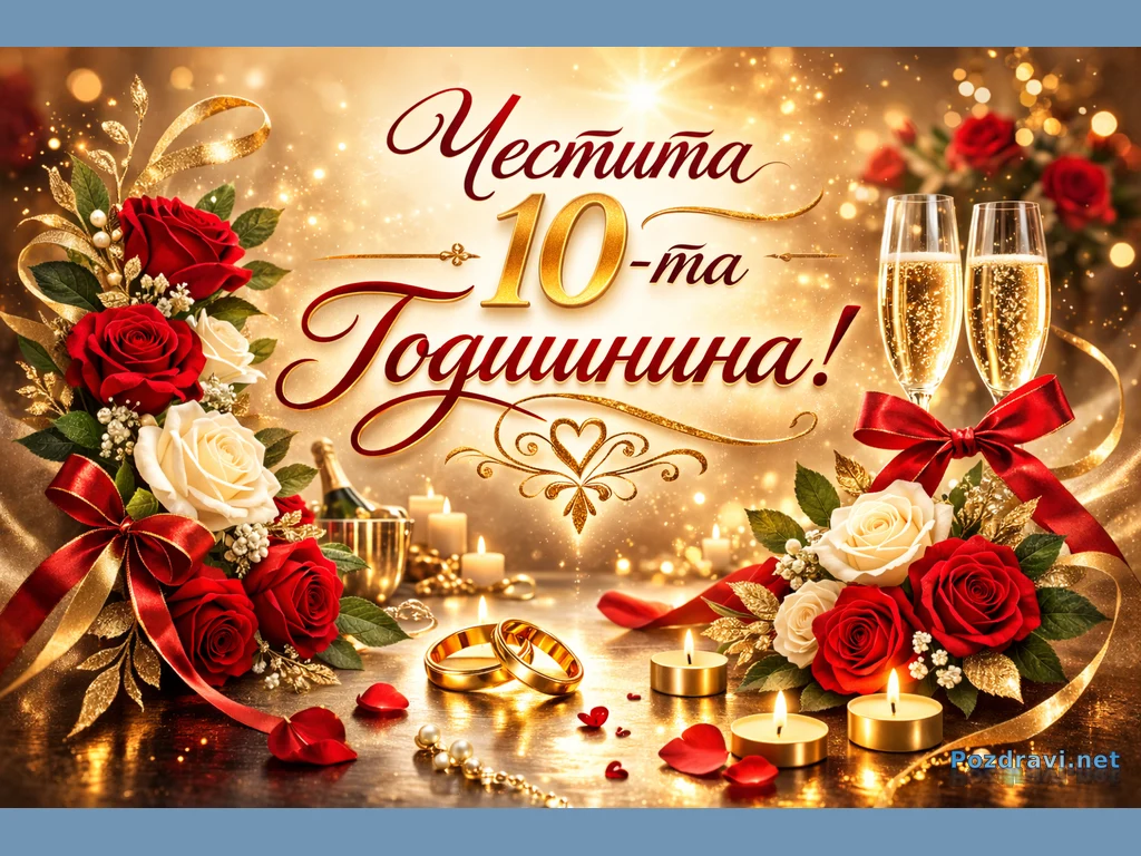 Ключови фрази: Честита 10-та годишнина, картичка за 10 години брак, романтична картичка, юбилейна годишнина, луксозна поздравителна картичка