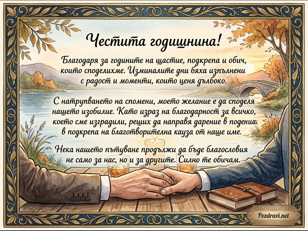Тази поздравителна картичка за годишнина е оформена с елегантна рамка в синьо и златно, украсена с листа. Централното място заема романтичен есенен пейзаж с река, каменен мост и дървета с оранжеви листа. В преден план, върху дървена маса, две ръце са нежно сплетени, символизирайки любов и единство. До тях има запалена свещ, две чаши с напитка и затворена книга, а текстът пожелава 'Честита годишнина!' и изразява дълбоки чувства и благодарност.