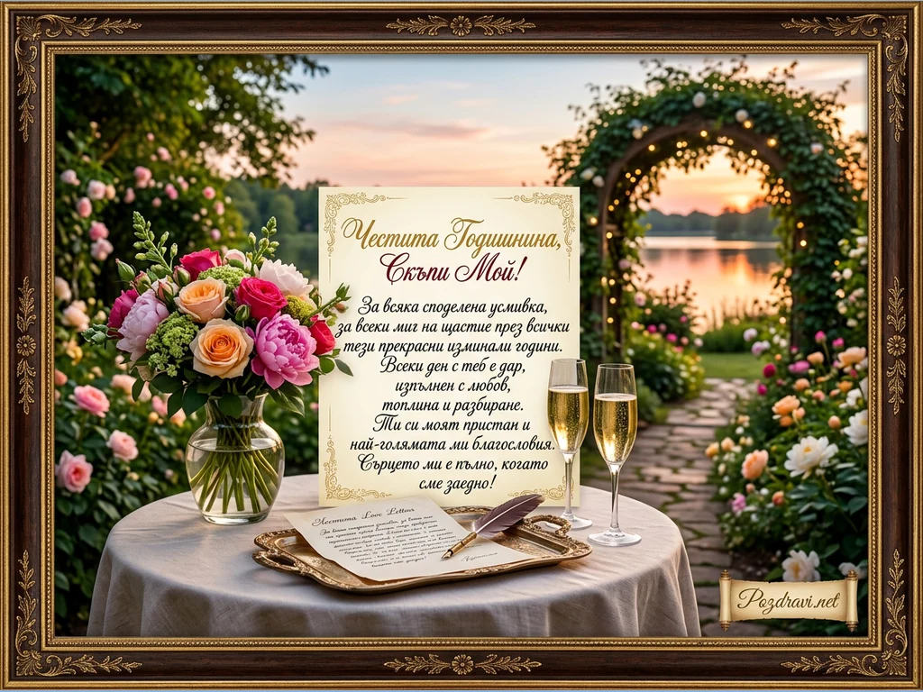 Тази романтична картичка е оформена в богато украсена златна рамка, разкриваща идиличен пейзаж. На преден план, върху кръгла маса, са поставени букет от свежи божури и рози, две чаши шампанско и поднос с любовно писмо и перо. Централно разположена е поздравителна картичка с надпис 'Честита Годишнина, Скъпи Мой!', съдържаща топло послание за споделени мигове. Фонът е живописна градина със залез над езеро и арка, обсипана с цветя, създаващи празнична и нежна атмосфера. В долния десен ъгъл на рамката е видим надпис 'Pozdravi.net'.