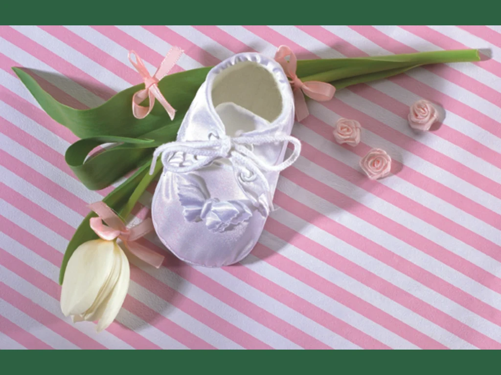 Ключови фрази: честито, бебе, картичка, подходяща, кръщение, сатенена, пантофка, бяло, лаленце, розови, розички, панделки, поздрави, пожелание, баба, дядо, щастие, надежда, любов
