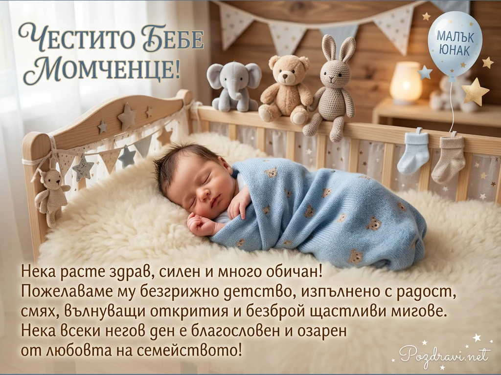 Спящо новородено момченце е нежно завито в синьо одеялце с мечета, легнало върху пухкава бяла овча кожа в дървено креватче. Над него са подредени сладки плюшени играчки – слонче, мече и зайче, а креватчето е украсено с гирлянди от звезди. В горния ляв ъгъл е изписано 'Честито Бебе Момченце!', а вдясно се вижда син балон с надпис 'МАЛЪК ЮНАК' и малки бебешки чорапки. Долното послание изразява сърдечни пожелания за здраве, щастливо детство и много любов.