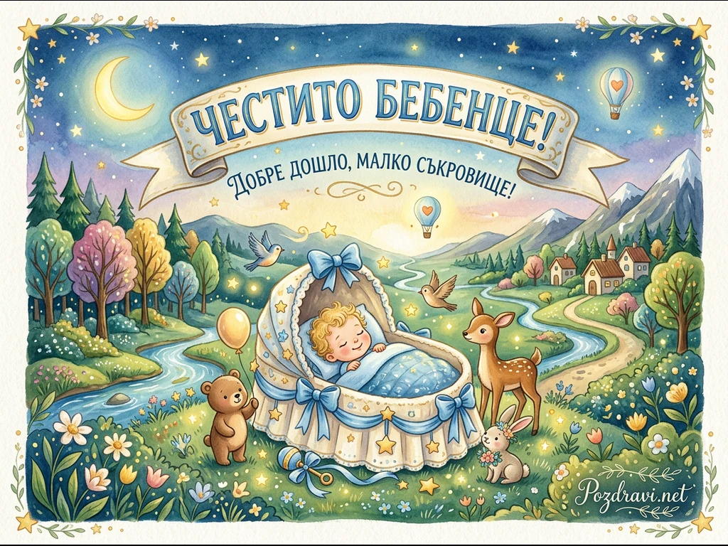 Тази акварелна илюстрация изобразява спящо бебе момченце в красиво декорирана люлка, поставена сред приказна горска поляна. Около люлката са събрани сладки горски животни – мече с балон, еленче и зайче, докато птички летят наоколо. Над сцената се извива лента с надпис 'ЧЕСТИТО БЕБЕНЦЕ! Добре дошло, малко съкровище!', а фонът е озарен от звездно нощно небе с полумесец, планини и малки къщички. Цялата композиция създава усещане за нежност, радост и вълшебство, посветени на новороденото.