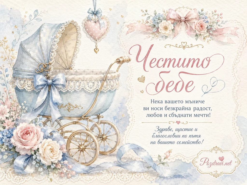 Вляво е изобразена синя ретро бебешка количка с дантелени кантове, панделка и златисти детайли по металната конструкция. Около нея има нежни рози, кремави цветя, евкалиптови листа и дълги сатенени ленти в бяло-сини тонове. В горната част виси сърцевидна розова украса с панделка и малко златно сърчице. Вдясно върху светъл орнаментиран фон е изписано 'Честито бебе', а под него стоят думите 'Нека вашето мъниче ви носи безкрайна радост, любов и сбъднати мечти!' и 'Здраве, щастие и благословии по пътя на вашето семейство!'. Цветовата гама е мека и пастелна, с усещане за нежност, празничност и семейна топлота. Цялата композиция напомня за деликатен акварелен стил и създава романтично настроение за посрещане на нов живот.