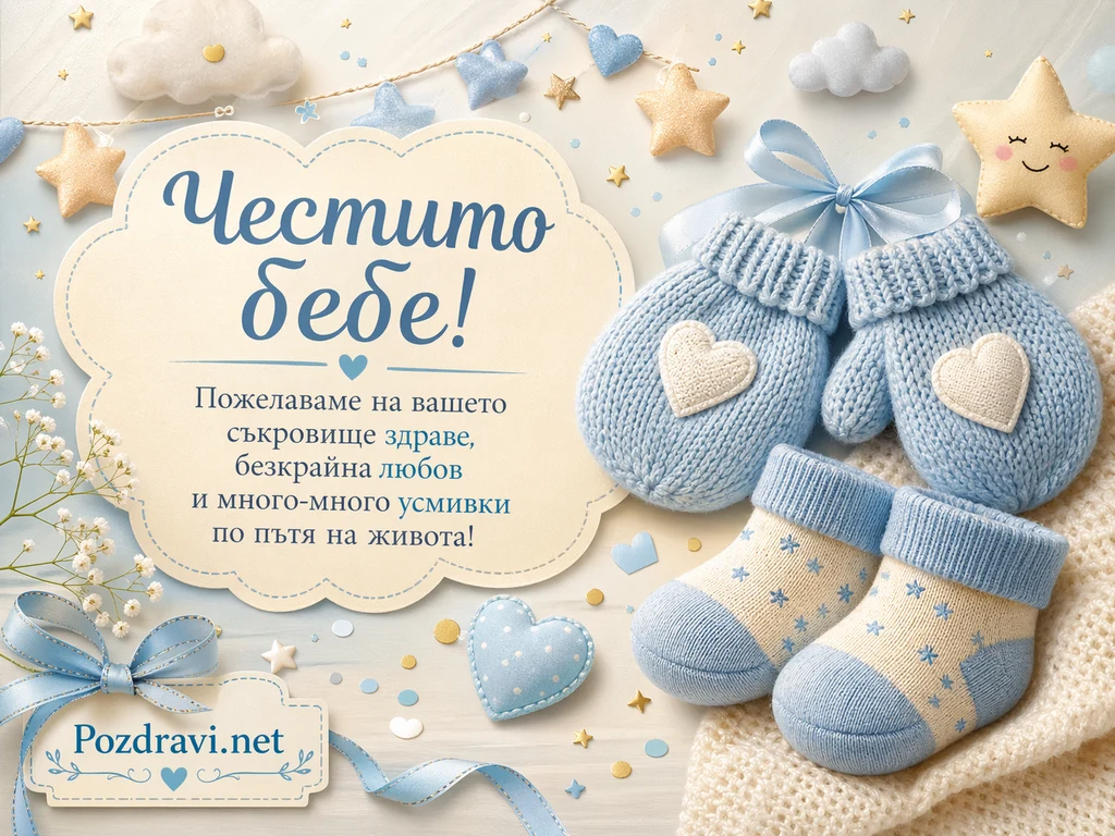 Меките пастелни тонове създават нежно и уютно настроение, а в композицията доминират синьо, кремаво и светлобежово. В центъра има облаковиден панел с декоративен шев, върху който е изписано 'Честито бебе!'. Под него стои текстът: 'Пожелаваме на вашето съкровище здраве, безкрайна любов и много-много усмивки по пътя на живота!'. Отдясно са подредени плетени бебешки ръкавички и терлички в светлосиньо с малки сърчица и панделка. Наоколо се виждат меки облачета, звездички, сърца и ситни декоративни елементи, които подсилват празничното и детско излъчване. Вляво и долу има панделки и фини цветя, които придават допълнителна деликатност на сцената. Цялата визия внушава топлота, грижа и радост, подходящи за празнуване на новородено.