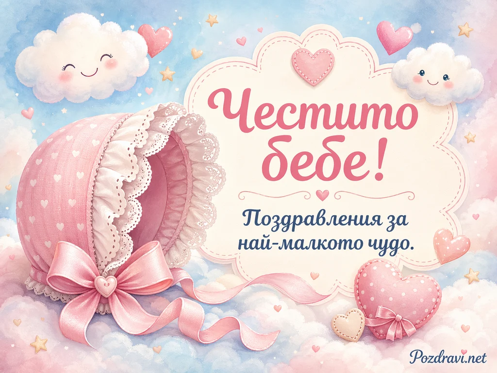 Картината е в нежна пастелна гама с синьо, розово и кремаво, напомняща ръчно рисувана бебешка илюстрация. Вляво стои голяма розова шапчица с дантела, панделка и малко сърце отпред. Около нея има пухкави облачета с усмихнати лица, малки сърца и звездички, които създават мечтателна и мека атмосфера. В центъра е голям облакообразен бял панел с розов контур, в който е изписано 'Честито Бебе!'. Под него се вижда и текстът 'Поздравления за най-малкото чудо.', подчертан с декоративна линия и сърце. В долната дясна част има розово сърце с панделка, а цялата композиция е подредена като празнична сценка за посрещане на новородено. Общото усещане е за нежност, топлина и радост от появата на бебе.