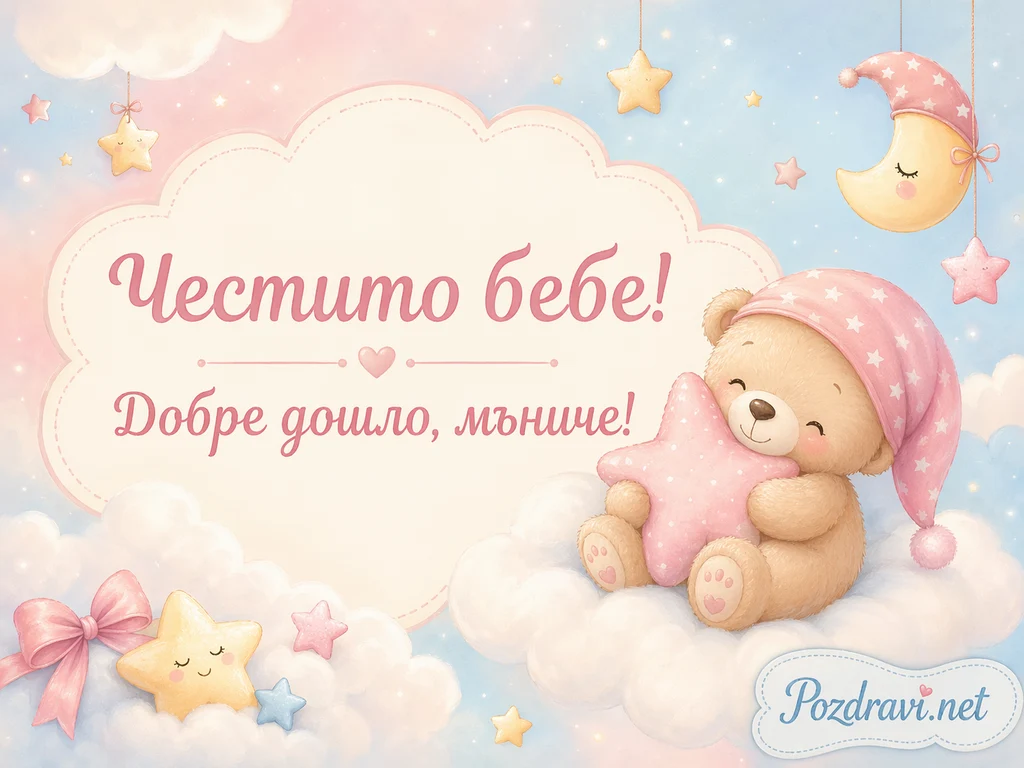 Меката сцена е изпълнена с пастелни розови и небесносини тонове, които създават много нежно и мечтателно настроение. В центъра има голямо бяло облаче с декоративен кант, върху което е изписано 'Честито бебе!'. Под него стои втори ред текст: 'Добре дошло, мъниче!'. Вдясно е нарисувано сладко мече, което седи върху облак и прегръща розова възглавничка със звезда, докато носи розова шапка с бели звездички. Около него се виждат висяща луна, звезди, облачета, малки сърчица и фини искри, които допълват приказната атмосфера. В долната лява част има розова панделка и усмихната звездичка, а цялата композиция изглежда като уютна детска сцена за посрещане на новородено.