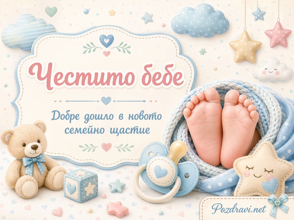 Меката пастелна композиция е изпълнена с нежни бебешки цветове, облачета и звездички. В центъра има голям декоративен етикет с надпис 'Честито бебе'. Под него стои текстът 'Добре дошло в новото семейно щастие', изписан в нежен син шрифт. Вдясно се виждат малки бебешки крачета, увити в плетено синьо одеяло. Около тях са подредени плюшено мече, биберон, играчка кубче, звездичка с усмивка и други сладки детайли. Цялата сцена създава усещане за топлина, уют и радост от появата на ново бебе.