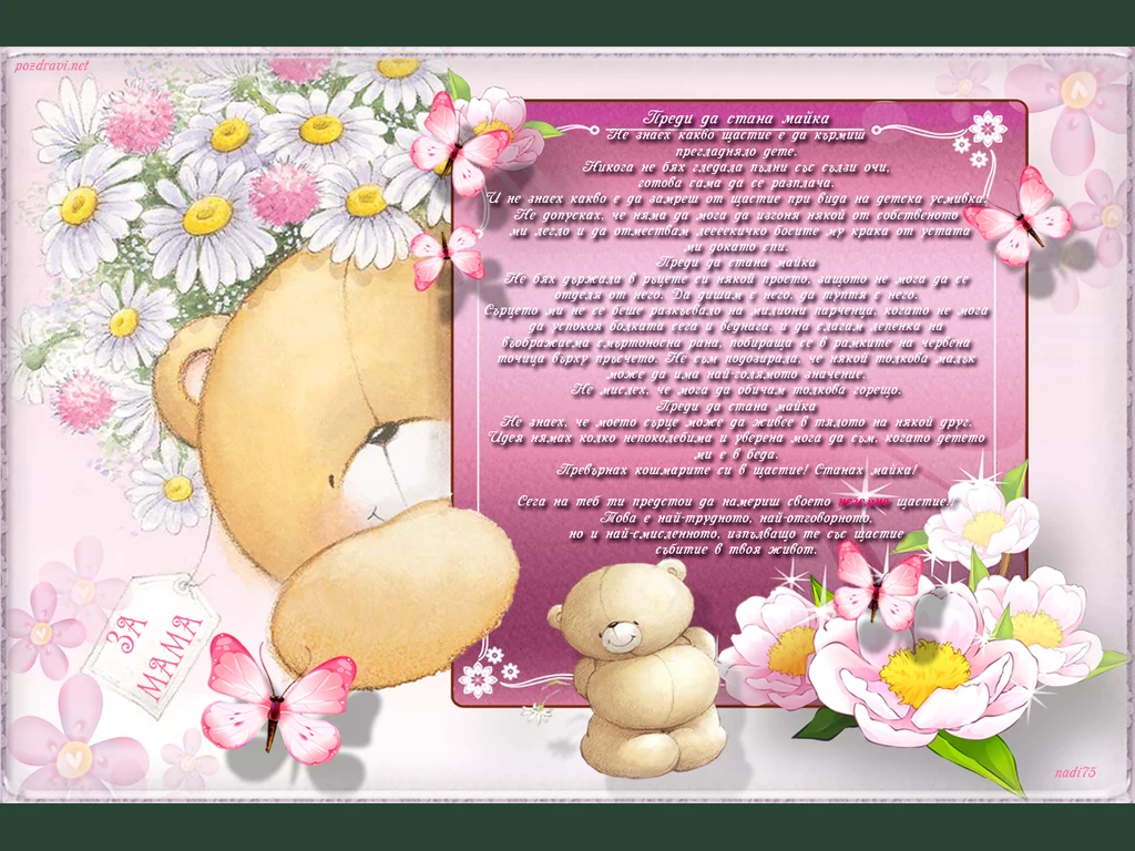 Ключови фрази: Мила мамо позцдрави пожелание радост щастие любов надежда нов живот бебе честито новородено цветя пеперудки маргаритки мечета картичка