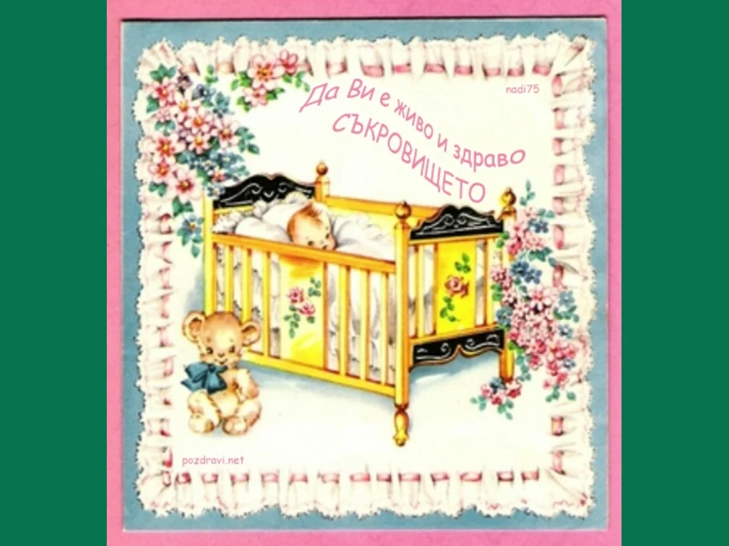 Ключови фрази: картичка, семейно, щастие, креватче, малкото, съкровище, мишле, мече, цветя, красота, любов, нежност, бъдеще, смисъл, нашия, дом, живот, здраве