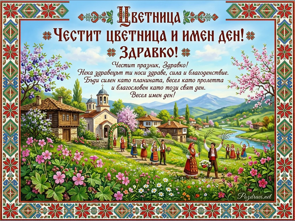 Ключови фрази: Честит Цветница, Имен ден Здравко, Българска картичка, Пролетен пейзаж, Народни носии