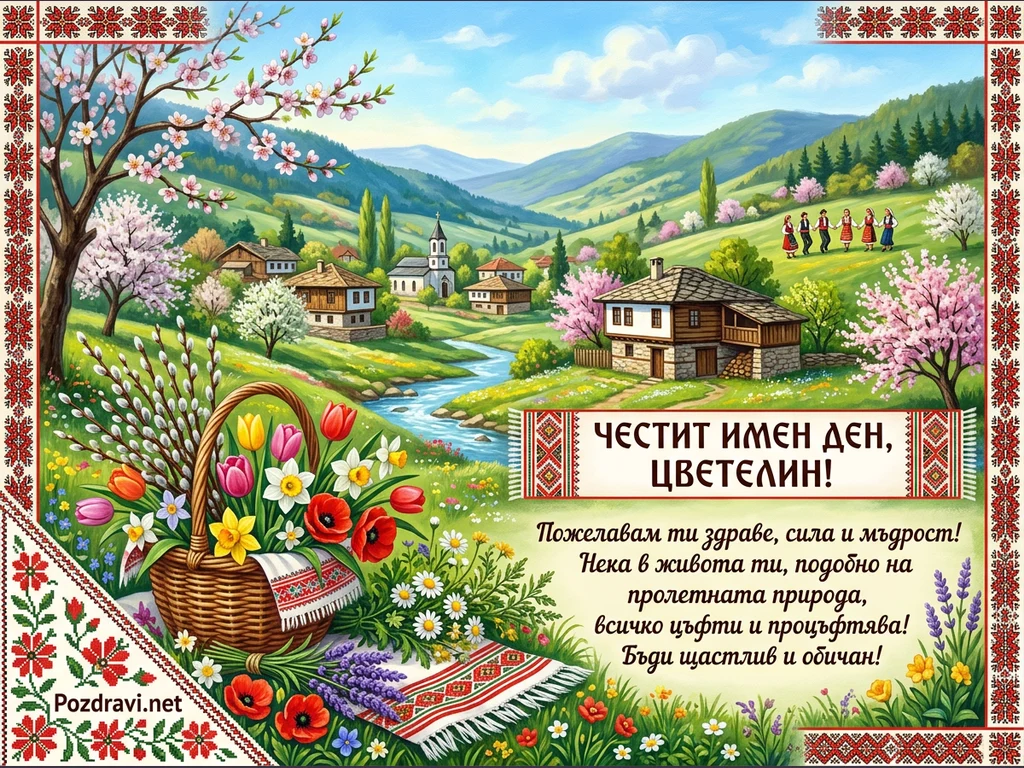 Ключови фрази: Имен ден Цветелин, Пролетна картичка, Български пейзаж, Цветя кошница, Народни носии