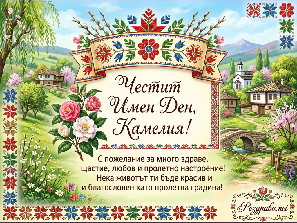Ключови фрази: Имен ден Камелия, Честитка пролет, Българска шевица, Пролетен пейзаж, Пожелания за имен ден