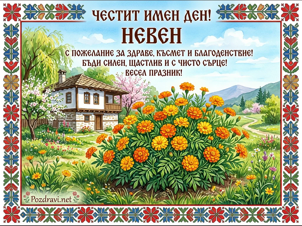 Ключови фрази: Честит имен ден Невен, поздравителна картичка, българска шевица, традиционна къща, цветя невен