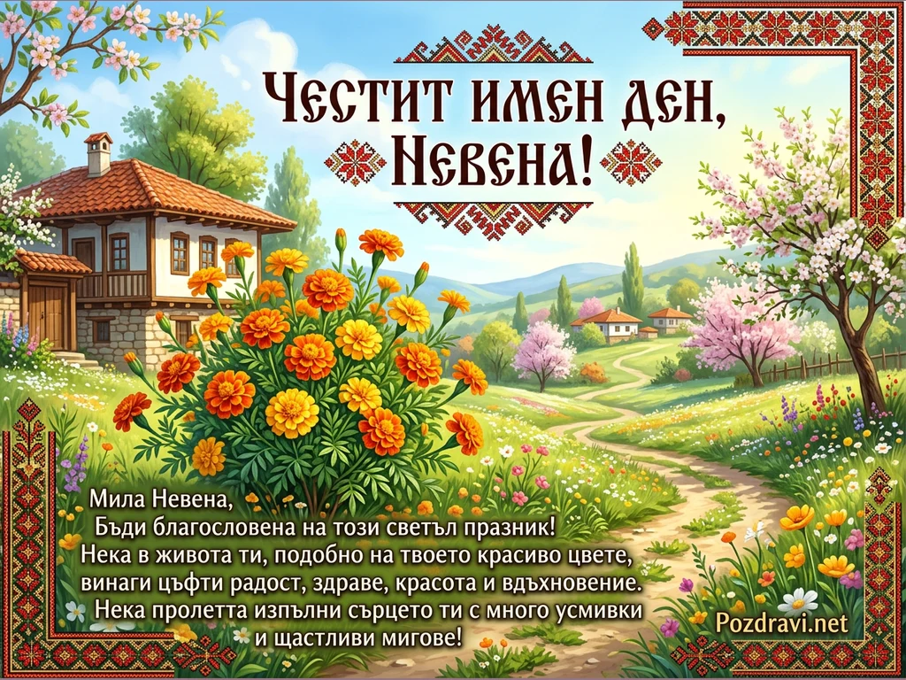 Тази ярка картичка за имен ден изобразява живописен пролетен пейзаж. В центъра на композицията е традиционна българска къща, пред която цъфти голям храст с оранжеви и жълти тагетеси. На заден план се виждат хълмове, осеяни с цъфтящи дървета и други къщи, свързани с криволичеща пътека. Картичката е украсена с традиционни български шевици по краищата и около поздрава 'Честит имен ден, Невена!'. Под него има персонализирано пожелание за радост, здраве и вдъхновение.