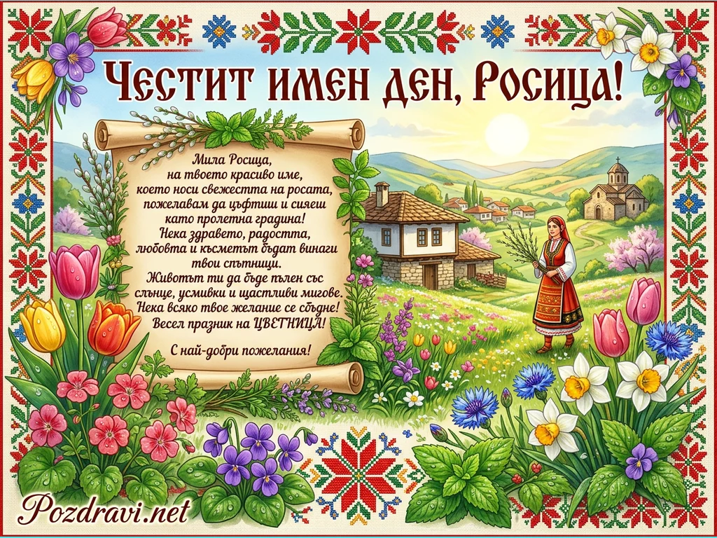 Тази празнична картичка поздравява Росица за нейния имен ден, изобразявайки живописен български пролетен пейзаж. В центъра на композицията е жена в народна носия, държаща върбови клонки, на фона на традиционни къщи и църква сред зелени хълмове. Картичката е богато украсена с рамка от ярки пролетни цветя като лалета, нарциси и теменужки, преплетени с елементи на българска шевица. Свитък с пожелание за здраве, радост и късмет допълва посланието за празника Цветница.