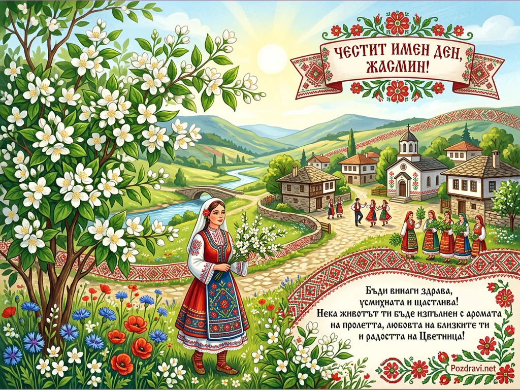 Тази живописна илюстрация изобразява традиционна българска пролетна или лятна сцена. В преден план е млада жена в народна носия, държаща букет бели цветя, до цъфтящ храст жасмин и поле с макове и метличини. На заден план се разкрива живописно село с църква, къщи в битов стил, река с каменен мост и зелени хълмове под ярко слънце. Хора в традиционни носии танцуват и се веселят по улиците, създавайки празнична атмосфера, допълнена от надпис 'ЧЕСТИТ ИМЕН ДЕН, ЖАСМИН!' и сърдечно пожелание.