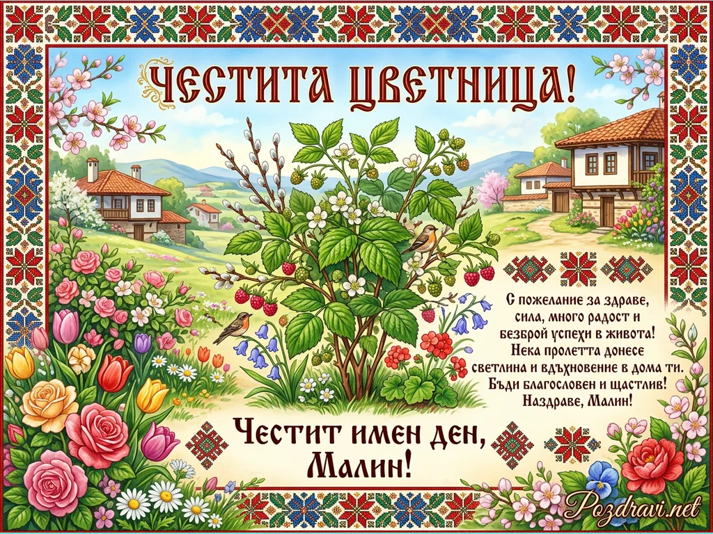 Тази празнична картичка за Цветница изобразява живописен пролетен пейзаж с традиционни български къщи, разположени сред зелени хълмове. Предният план е изпълнен с изобилие от цъфтящи цветя като рози, лалета, маргаритки и камбанки, както и храст с малини и върбови клонки. Две малки птички са кацнали сред растителността, допълвайки идиличната сцена. Картичката е рамкирана с красиви български шевици и съдържа поздравителни надписи за празника и имен ден на Малин, заедно с пожелания за здраве и успех.