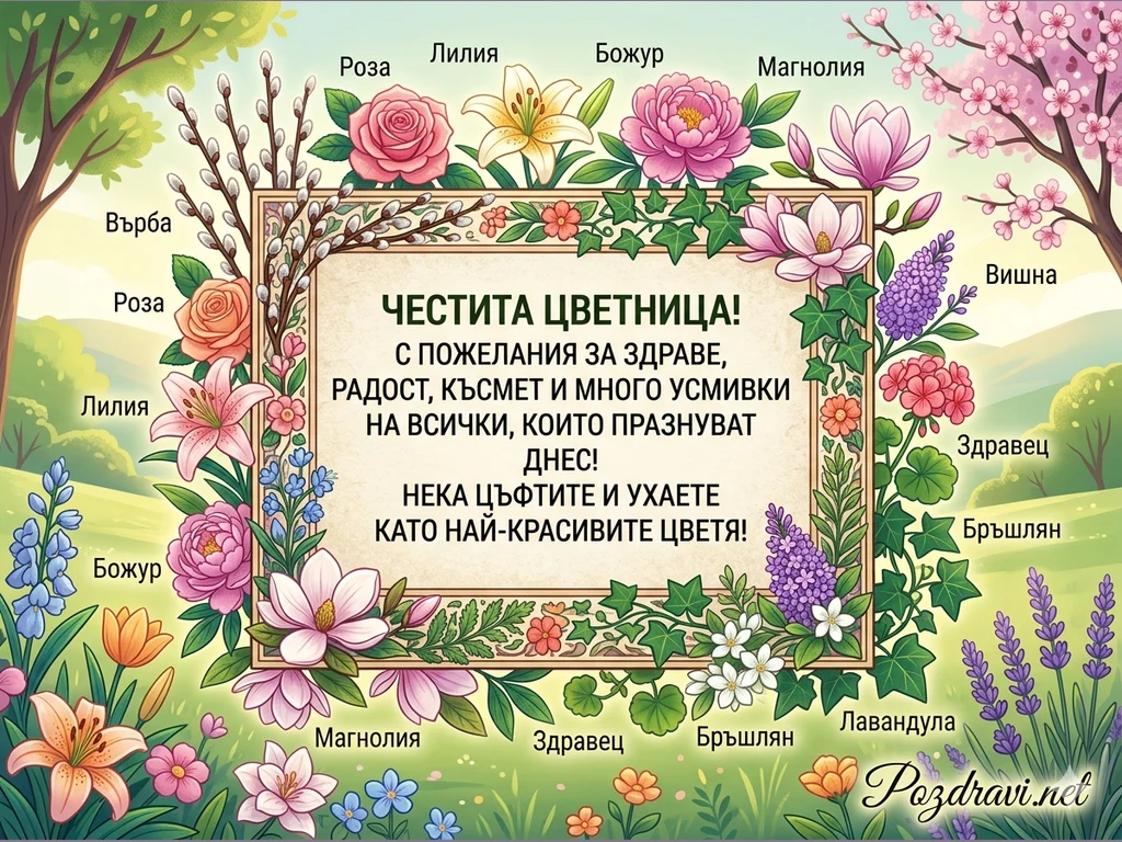 Тази дигитална картичка за Цветница е създадена в красив, илюстративен стил и е предназначена да носи радост и пролетно настроение. Централното място в нея заема богато украсена правоъгълна рамка, изработена от преплетени клони на върба (пухчета), различни видове рози, лилии, магнолии, божури, здравец, вишна, лавандула и бръшлян. Самата рамка съдържа сърдечно пожелание на български език, изписано в тъмен, четлив шрифт на светлобежов фон, наподобяващ пергамент: 'ЧЕСТИТА ЦВЕТНИЦА! С ПОЖЕЛАНИЯ ЗА ЗДРАВЕ, РАДОСТ, КЪСМЕТ И МНОГО УСМИВКИ НА ВСИЧКИ, КОИТО ПРАЗНУВАТ ДНЕС! НЕКА ЦЪФТИТЕ И УХАЕТЕ КАТО НАЙ-КРАСИВИТЕ ЦВЕТЯ!'