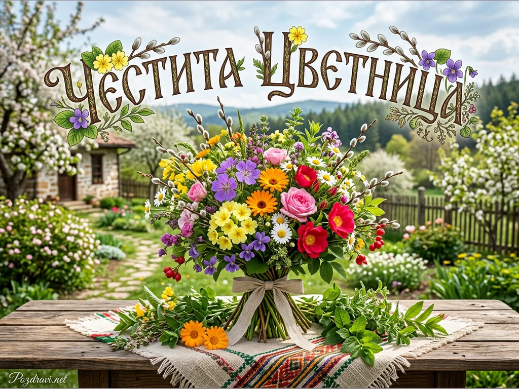 На картичката е изобразен пищен пролетен букет от разнообразни цветя, включително рози, маргаритки, невен и върбови клонки, завързан с панделка. Букетът е поставен върху дървена маса, покрита с традиционна българска шевица. Заден план разкрива живописна селска градина с цъфтящи дървета, малка къща и зелени хълмове под ясно небе. Над букета е изписан празничният надпис 'Честита Цветница', украсен с флорални елементи. Цялостната композиция създава усещане за пролет, празник и българска традиция.