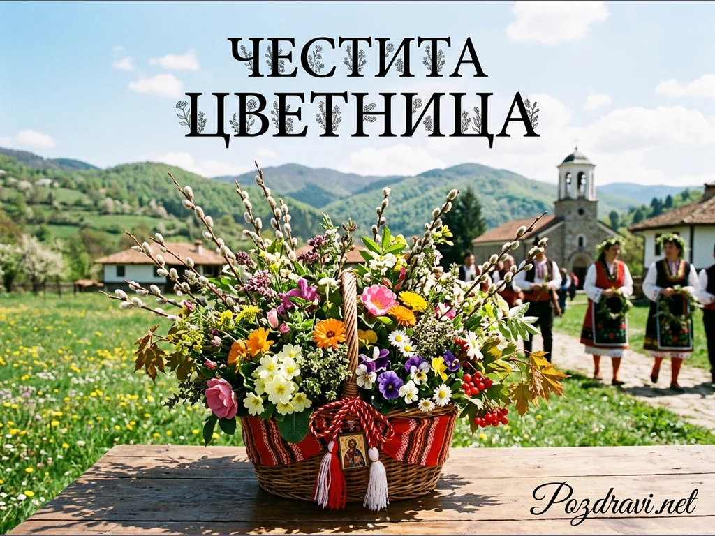 На преден план е поставена голяма плетена кошница, обилно напълнена с разнообразни пролетни цветя, включително върбови клонки, теменужки, маргаритки и яркочервени плодове. Кошницата е украсена с червено-бяла панделка и малка икона, символизиращи българската традиция. Зад нея се разкрива живописен селски пейзаж с цъфтящи поляни, традиционни къщи и старинна църква. На заден план се виждат хора в народни носии, които вървят по калдъръмена пътека, а над цялата сцена е изписано 'ЧЕСТИТА ЦВЕТНИЦА'. Планинският фон и ясното синьо небе допълват празничната и автентична атмосфера.
