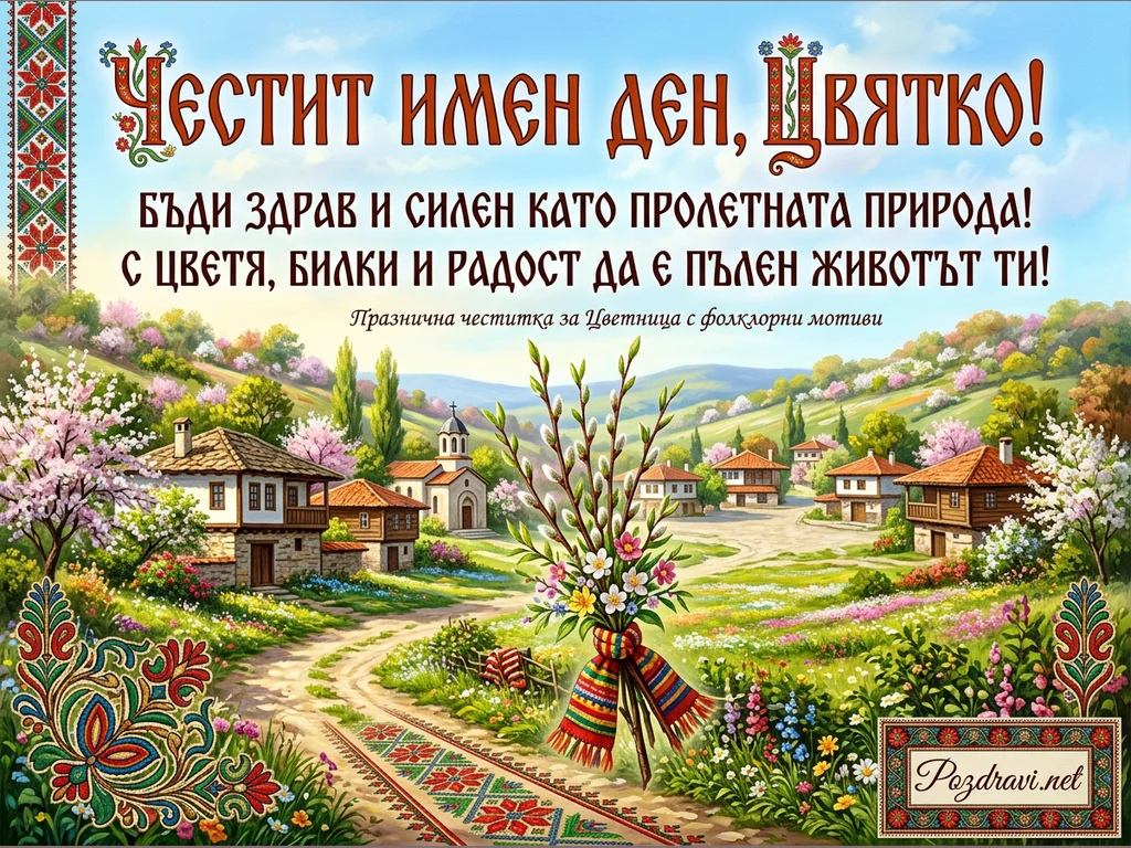 Ключови фрази: Честитка Цветница, Имен ден Цвятко, Пролетна картичка, Български мотиви, Пожелания за здраве