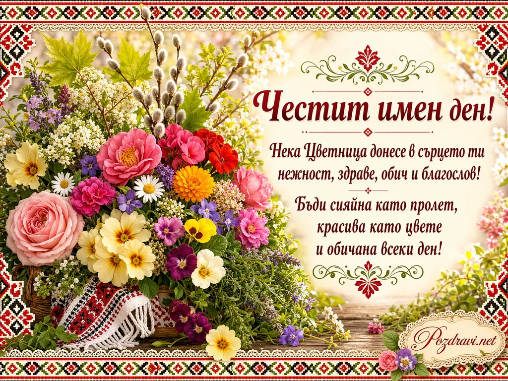 Ключови фрази: картичка за Цветница с шевици, букет с върбови клонки и пролетни цветя, български фолклорни мотиви за имен ден, женски имен ден за Цветница