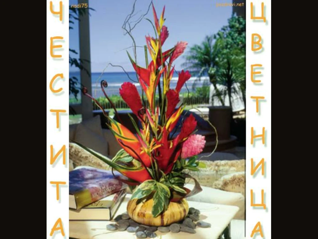 Ключови фрази: елегантен букет икебана маса книги камъчета морски бряг лагуна пристан вълни океан любов красота празнуват всички носещи имена цветя Невена Лена Незабравка Виолета Здравко Алена Цвети Цветана