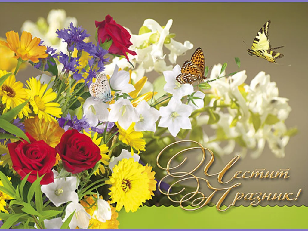 Колоритен букет - картичка за Цветница с много цветя и пеперуди!