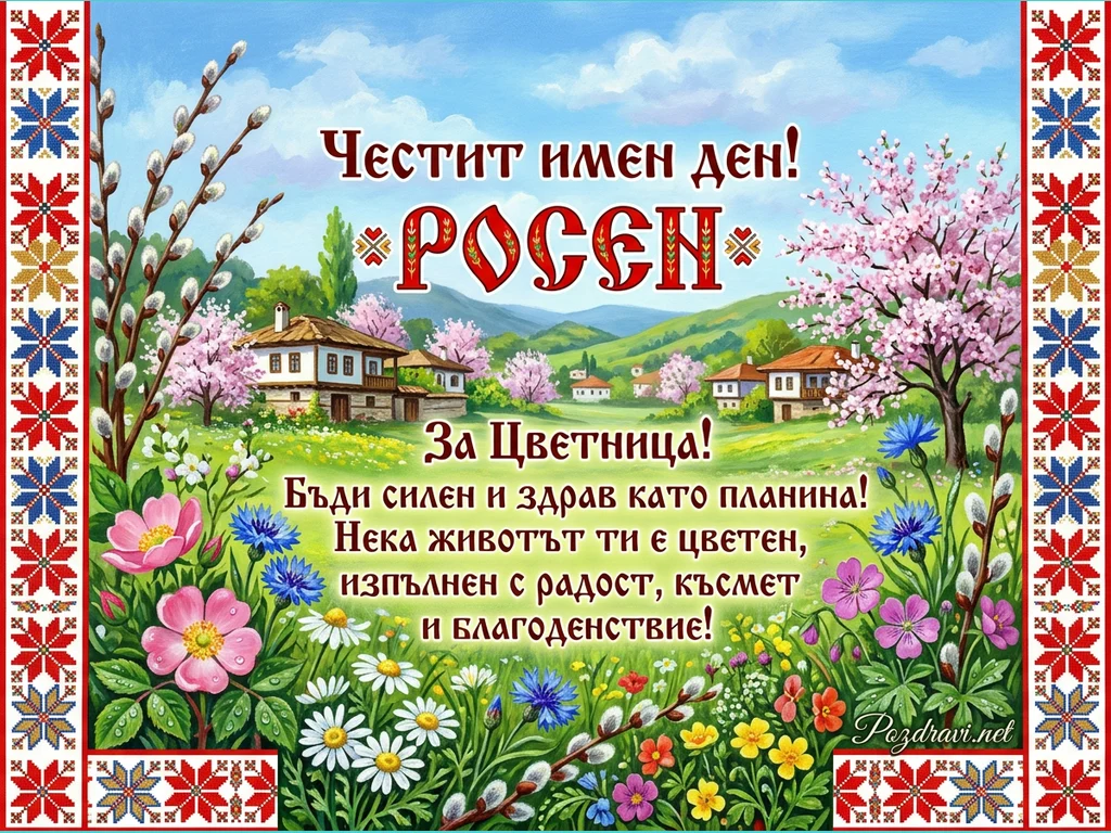 Ключови фрази: Честит имен ден Росен, Поздрав за Цветница, Пролетна картичка, Български мотиви, Пожелание за имен ден
