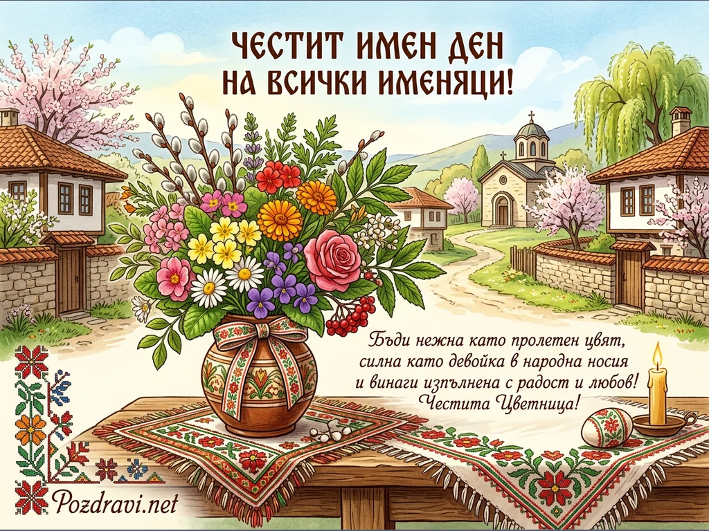 Тази цветна илюстрация е празнична картичка за имен ден и Цветница. В центъра е разположен голям букет от пролетни цветя – рози, маргаритки, невен и върбови клонки, аранжиран в традиционна българска ваза с панделка. Букетът е поставен върху дървена маса, покрита с бяла покривка с красива българска шевица, до запалена свещ и великденско яйце. На заден план се вижда живописен български пейзаж с къщи в традиционен стил, църква, цъфнали дръвчета и хълмове под ясно синьо небе. Картичката съдържа надписи 'ЧЕСТИТ ИМЕН ДЕН НА ВСИЧКИ ИМЕНЯЦИ!' и пожелание 'Честита Цветница!'.